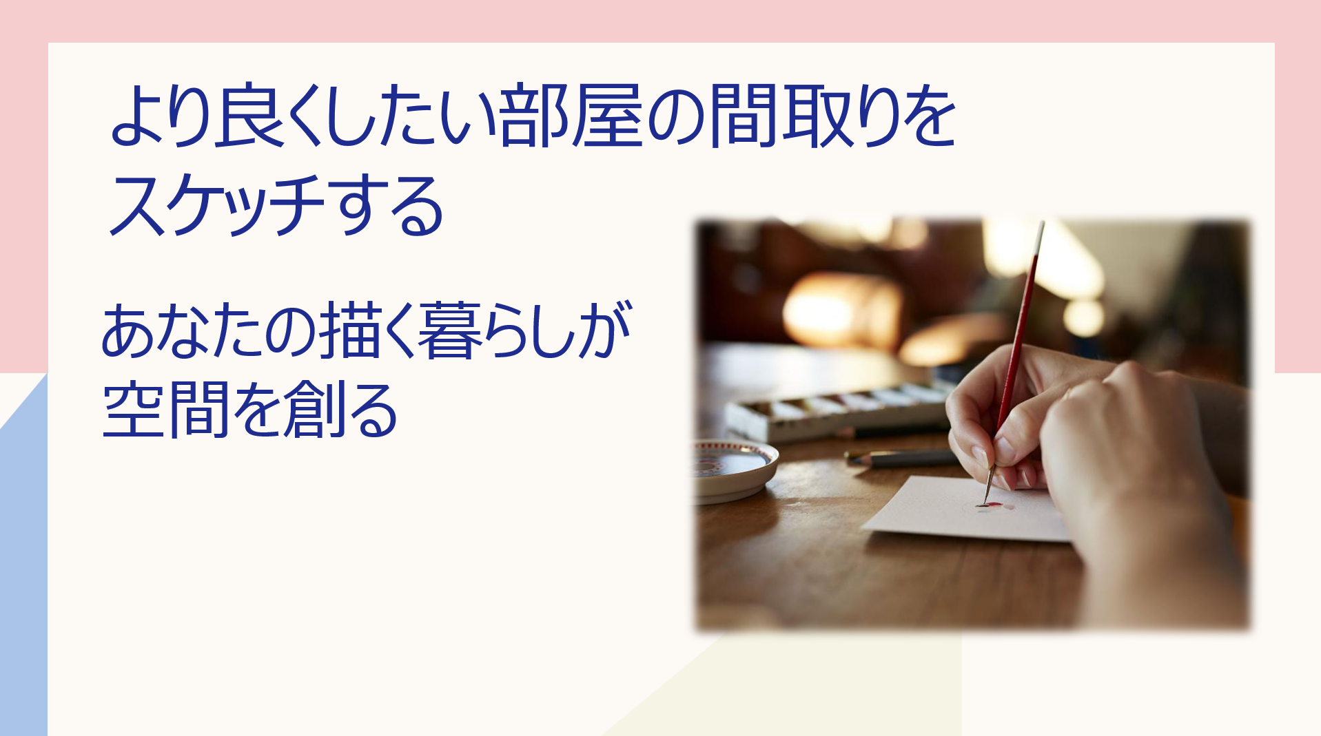 HOME > より良くしたい部屋の間取りをスケッチする 皆さんに3枚の紙を用意していただきます。 マス目のある方眼紙2枚と、カーボン紙1枚を間に挟み、3枚の紙をクリップで留めます。 きれいに書こうと思わなくても大丈夫ですので、まずは実際にご自宅の間取りを書いていただきます。 カーボン紙を挟んで、もう一枚の紙にも間取り図が写されます。 二枚の間取り図を使って、机上ですが、現状と理想と、ビフォーアフターを一緒に描いていきたいと思います。早速、間取りから描いていきましょう。 間取りをかきおえたら、クリップを取り、各用紙を離しましょう。 2026年3月25日 author