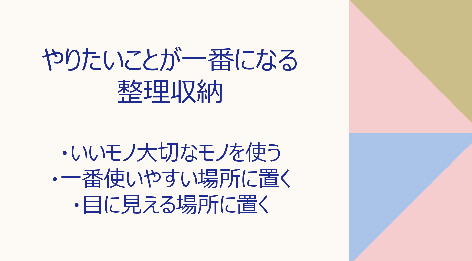 HOME > やりたいことが一番になる整理収納 いいモノ、大切なモノを使いやすくし、実際に使いましょう。または目に見える場所に置きましょう。 所有ではなく、使用が大切です。 お客様用の布団に寝て、お客様用の食器を使ってください。 皆さんの人生で大切にするべきは、まずは皆さんご自身だと思います。 やりたいことが一番になるように、整理収納をして行きましょう。 やりたいことが後押しされる環境を作りましょう。 2026年3月7日 author